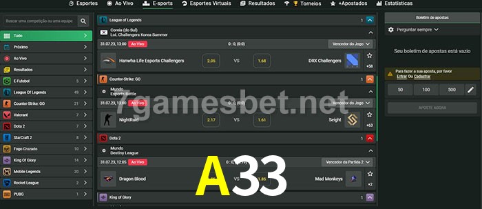 O A33 oferece uma grande seleção de opções de apostas em e-sports com probabilidades competitivas